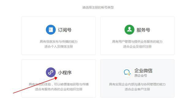 3、選擇注冊賬號的類型,我們選擇小程序。