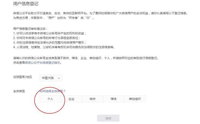 6、激活后,選擇用戶信息主體類型個人需要注意的是個人類型暫不支持微信認(rèn)證、微信支付功能。企業(yè)主體信息提交后不可更改。
